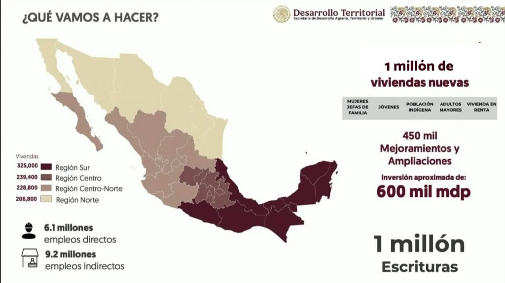 En el salón Tesorería de Palacio Nacional, la funcionaria federal detalló la ubicación, por región, de la construcción de este millón de viviendas nuevas: 325 mil en la sur; 239 mil 400 en la centro; 228 mil 800 en la centro-norte; y 206 mil 800 en la norte.