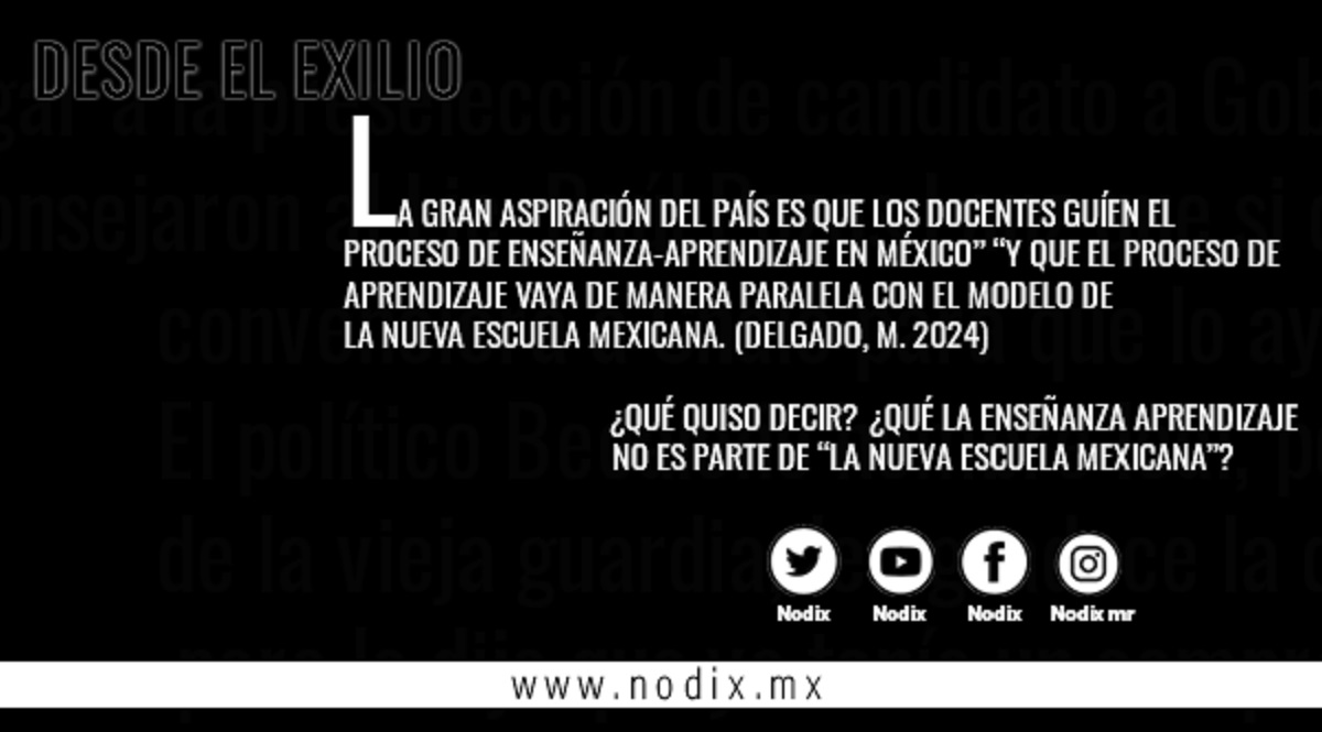 APLICADO DON MARIO DELGADO, LES PROPUSO A LOS MAESTROS SE PONGAN AL FRENTE DE LA TRANSFORMACIÓN DEL PAÍS Y QUE PROPICIEN LA FORMACIÓN DE CIUDADANOS LIBRES Y CRÍTICOS, AUNQUE, CREO QUE ESTO NO ES NECESARIO PROPONÉRSELO A LOS MAESTROS. SIEMPRE HAN SIDO AGENTES DE CAMBIO EN SUS COMUNIDADES. ESTE DISCURSO LO DIÓ EN LA CEREMONIA DEL “DÍA MUNDIAL DE LAS Y LOS DOCENTES”, Y AGREGÓ: “LA GRAN ASPIRACIÓN DEL PAÍS ES QUE LOS DOCENTES GUÍEN EL PROCESO DE ENSEÑANZA-APRENDIZAJE EN MÉXICO”, AUNQUE, ESO ES PRECISAMENTE LO QUE HACEN LOS MAESTROS. Y CONTINUO SU DISCURSO MENCIONANDO, “Y QUE EL PROCESO DE APRENDIZAJE VAYA DE MANERA PARALELA CON EL MODELO DE LA NUEVA ESCUELA MEXICANA”.