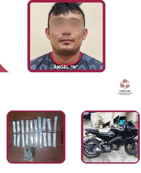 La detención se llevó a cabo la mañana de este jueves 11 de septiembre, en Ciudad del Carmen, cuando los Agentes Ministeriales sorprendieron a Ángel “N” en posesión de las sustancias ilícitas y de una motocicleta marca Bajaj, color negro, con placa de circulación 60GSP6 del estado de Campeche.